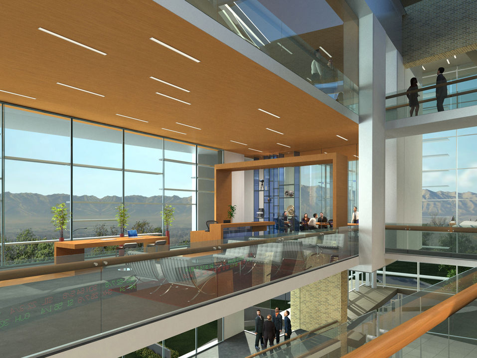The building was designed to interact with the original business building which is directly adjacent to this site. The atrium provides commanding views over the Wellsville Mountain Range, and will be able to be seen from all parts of Cache Valley. This building was designed to occupy a a prime location on the campus, and would serve as an entry element for the campus. The building provides an iconic and progressive image which mirrors the modern curriculum.