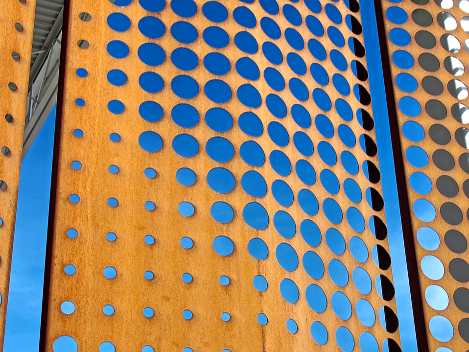 The client also requested a material that would require little maintenance. The architect chose perforated steel panels as the material for the skin. As the metal naturally oxidizes, it creates a self-sealed surface which